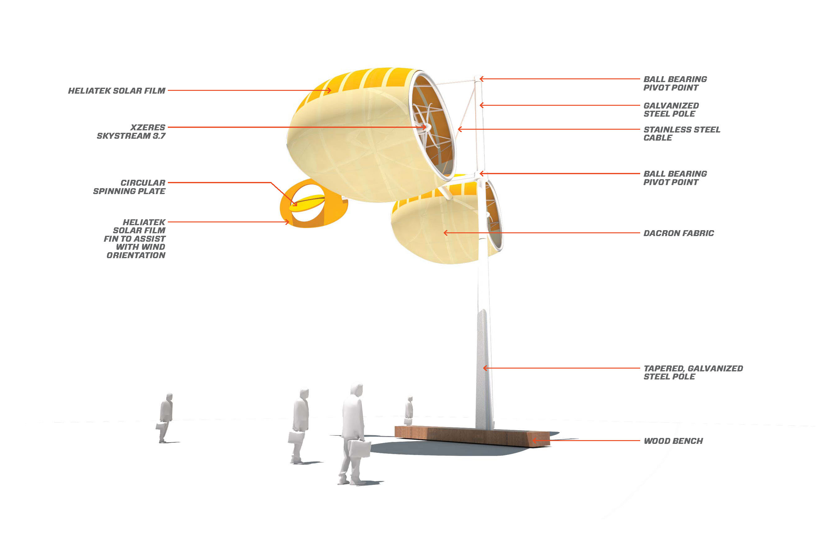 As they linger on their way through this beautiful place, they will discover that the pods above them are at that very moment generating clean electricity with a mix of wind and solar technologies. Perhaps they'll take a moment to sit on the wood bench and charge their phone with the energy that the artwork is generating. From there they will see an interpretive display showing how much electricity is being generated at that very moment from wind and solar, and how much has been generated since its installation.