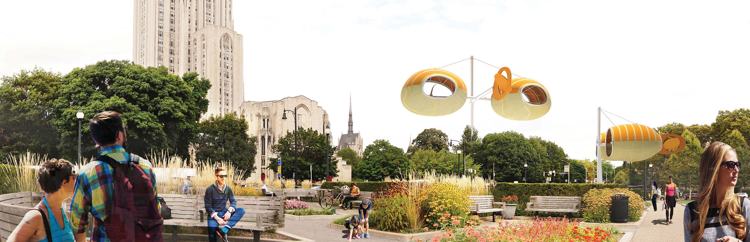 The concept for the ground plane was to provide a habitat for the animals that nest in the area. In the new urban context of Schenley Plaza, the ground plane will provide a habitat for urban dwellers like you!